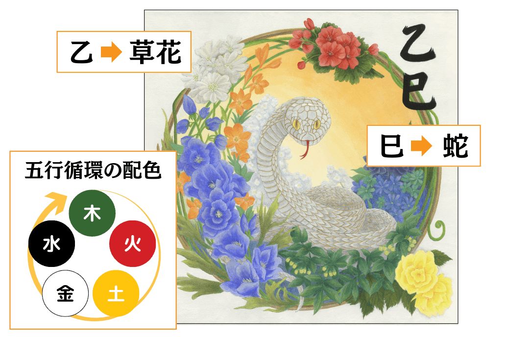本作では、陰陽五行の考え方をもとに、草花の生命力と、蛇が象徴する再生や変化のエネルギーを一枚の画面に重ねました。新しい流れが芽吹き、巡っていく一年となるよう、そんな願いを込めています。