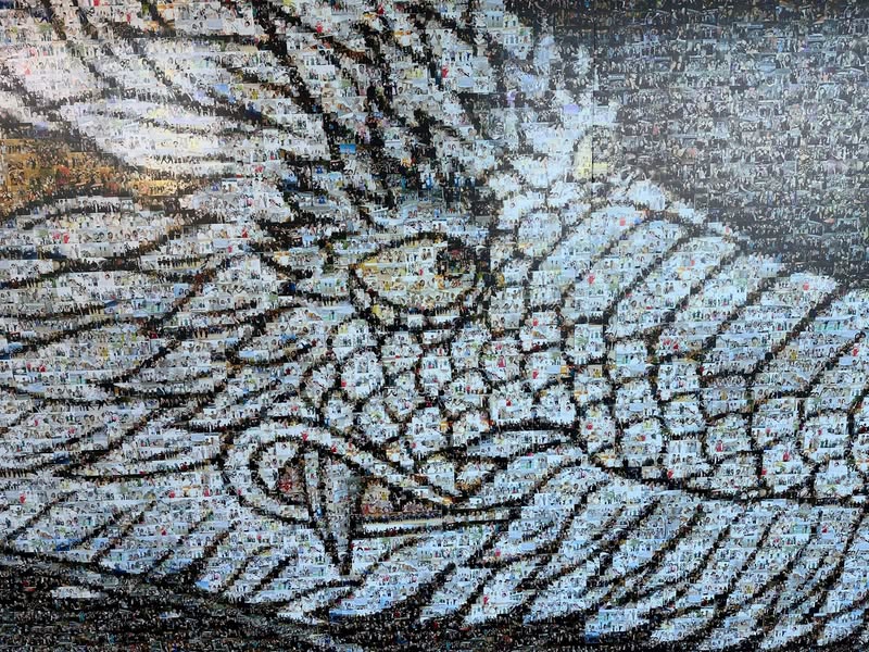 本作品は、全国・海外から寄せられた「手をつなぐ写真」を一枚一枚モザイクのピースとして構成しています。人と人とのつながり、その一つひとつの瞬間が集まり、ひとつの大きな龍の姿を形づくっています。