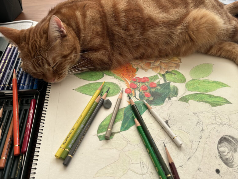 秋の切り花とプランターを描いた絵です。
