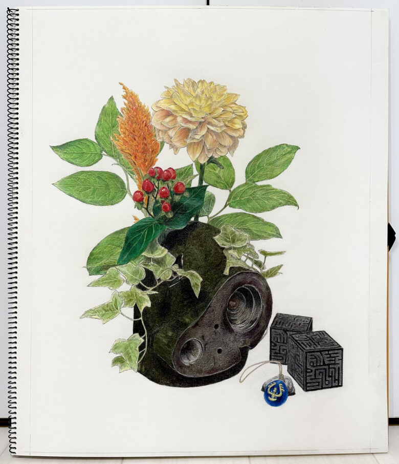 プランターは『天空の城ラピュタ』に出てくるロボット兵の頭部です。静物として飛行石と要石(2つの立方体)を配置しています。背景は映画の中でラピュタにたどり着いた時に出てくる屋上の森をイメージしています。