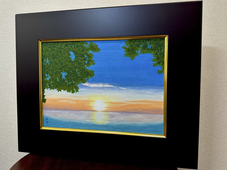 朝焼けの海、自然の美しさに包まれている様子を絵にしました。