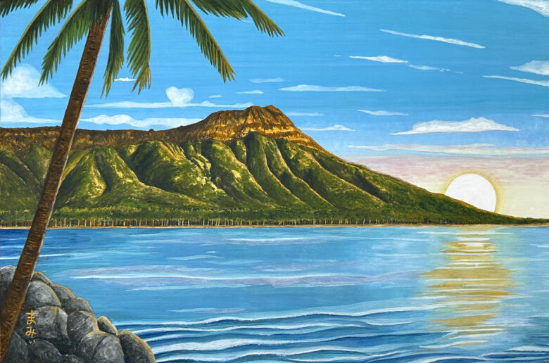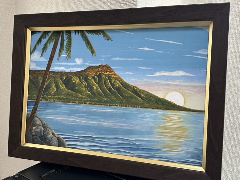 完成した絵を受け取り、初めて見た瞬間、ものすごいエネルギーを感じました。僕が大好きな早朝の時間に、朝日が昇るダイヤモンドヘッドと海を眺める。この生活は必ず実現すると思わせてくれる、言葉に出来ない神秘的なパワーを感じました。